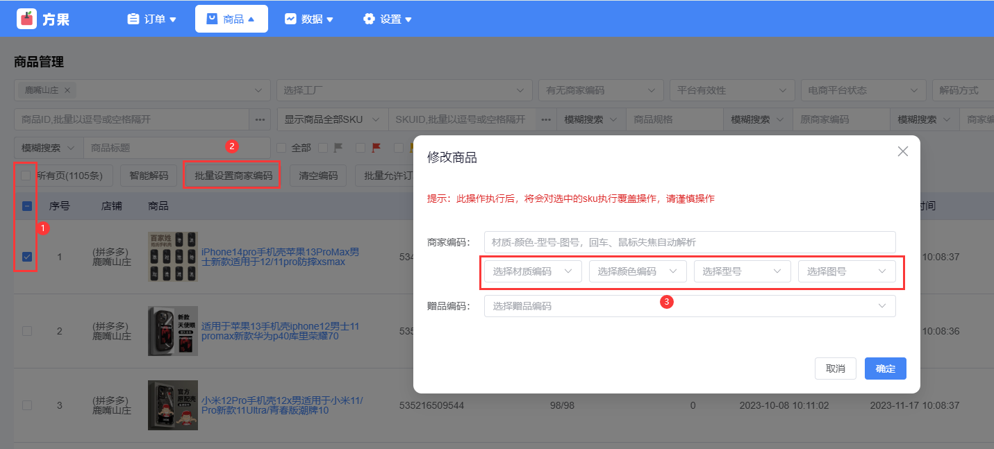 方法2:【商品】页面,选择一条或多条商品链接,点击批量设置商家编码,将链接中相同的属性批量填充。