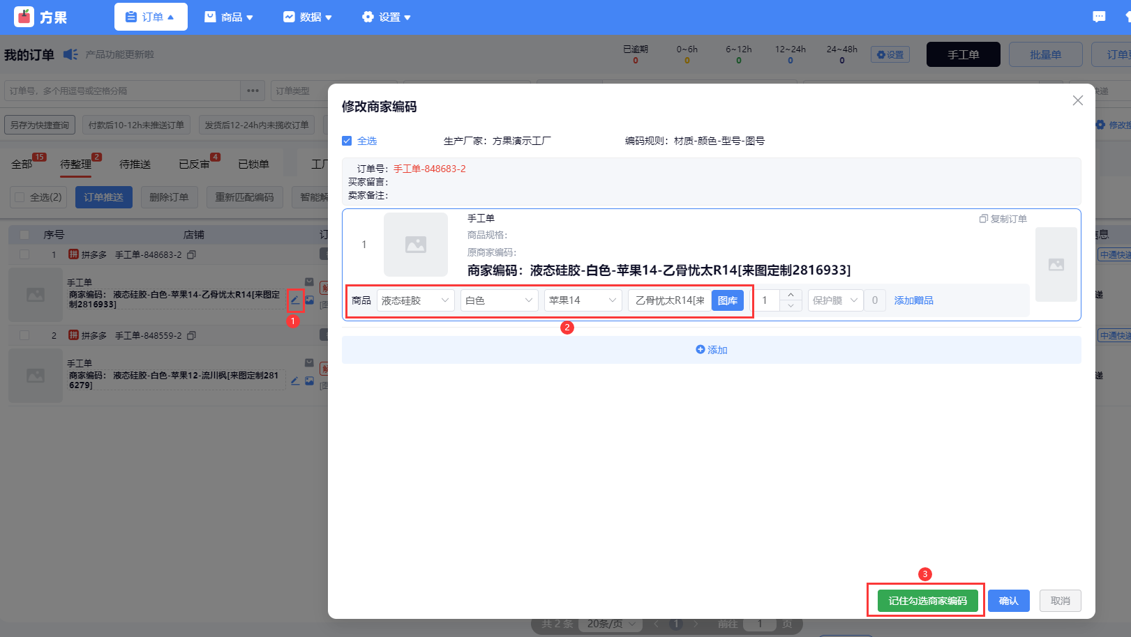 方法3:【订单】页面,点击修改商家编码,修改完成之后点击记住勾选商家编码,该商家编码会自动记住,下次产品订单会自动解码。