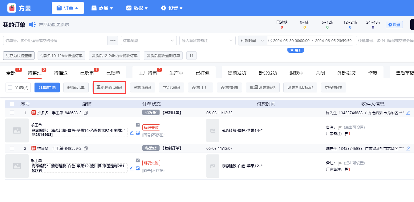 方法4:如果大量订单出现解码失败的情况,可以先使用方法1和方法2,再到【订单】界面全选订单使用重新匹配编码。