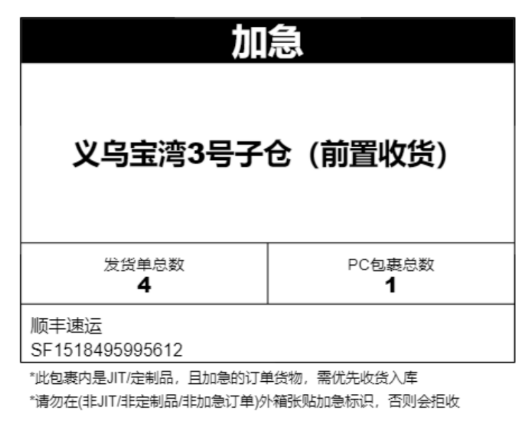 - 这个外箱标识只有JIT和定制的加急订单才有,需要贴在箱子最外侧,用于temu方的优先入库