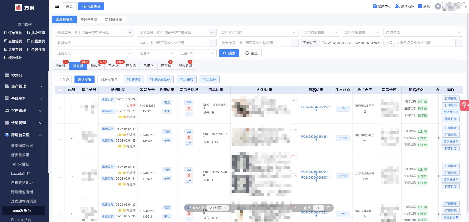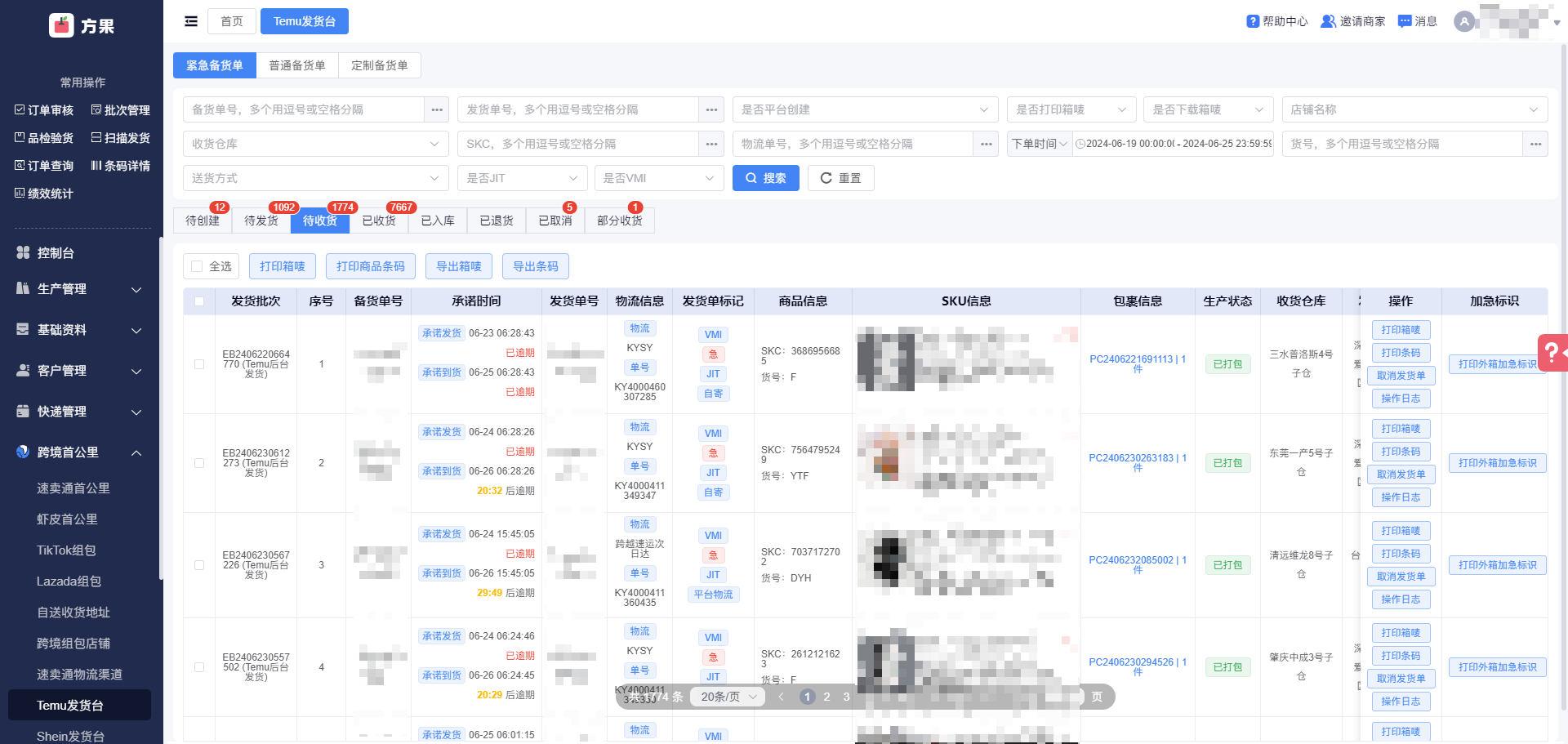 - 创建成功的发货单,会流转到“待发货”下,平台会返回包裹号、发货单号,同时系统也会获取箱唛、条码数据