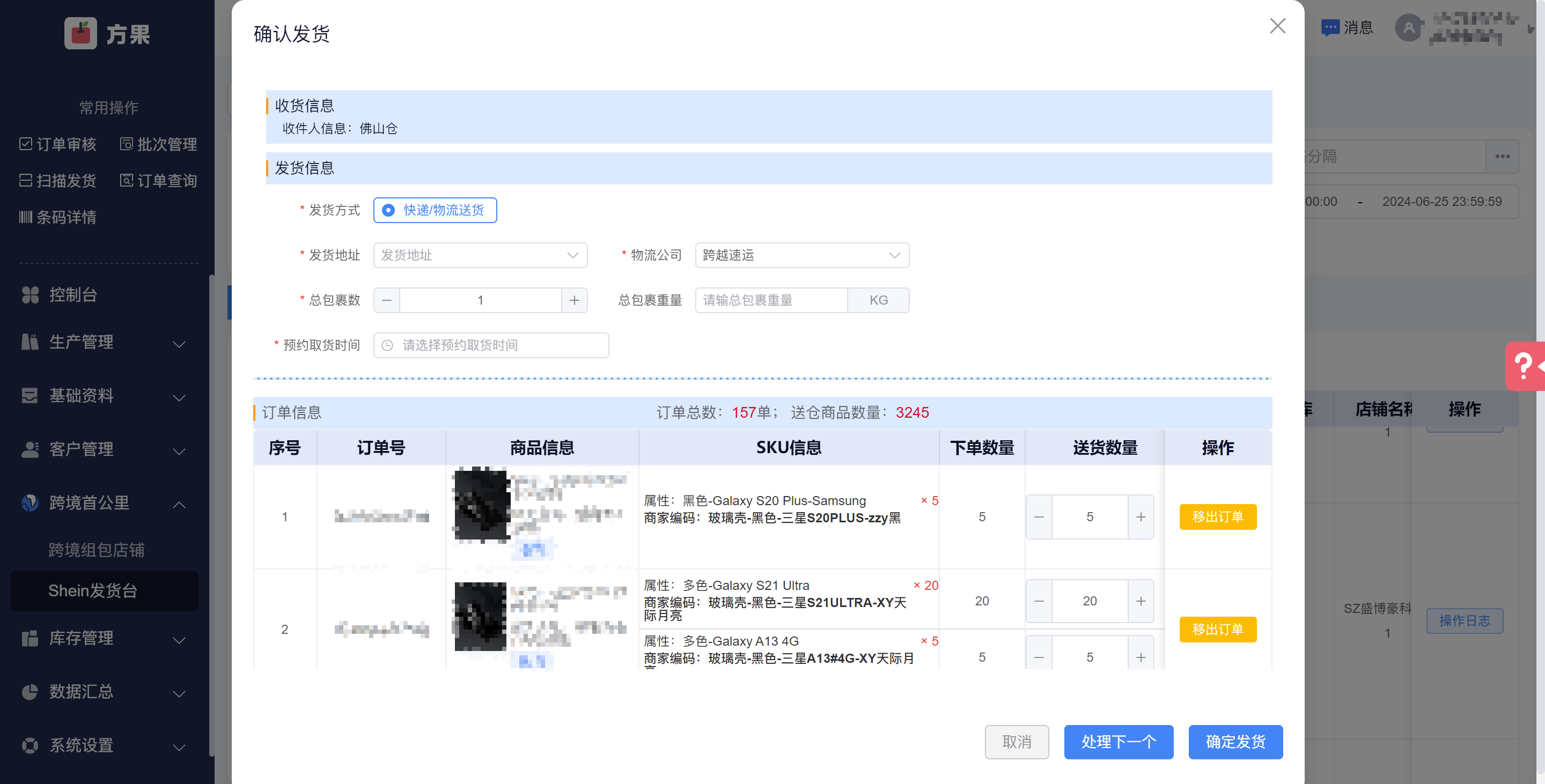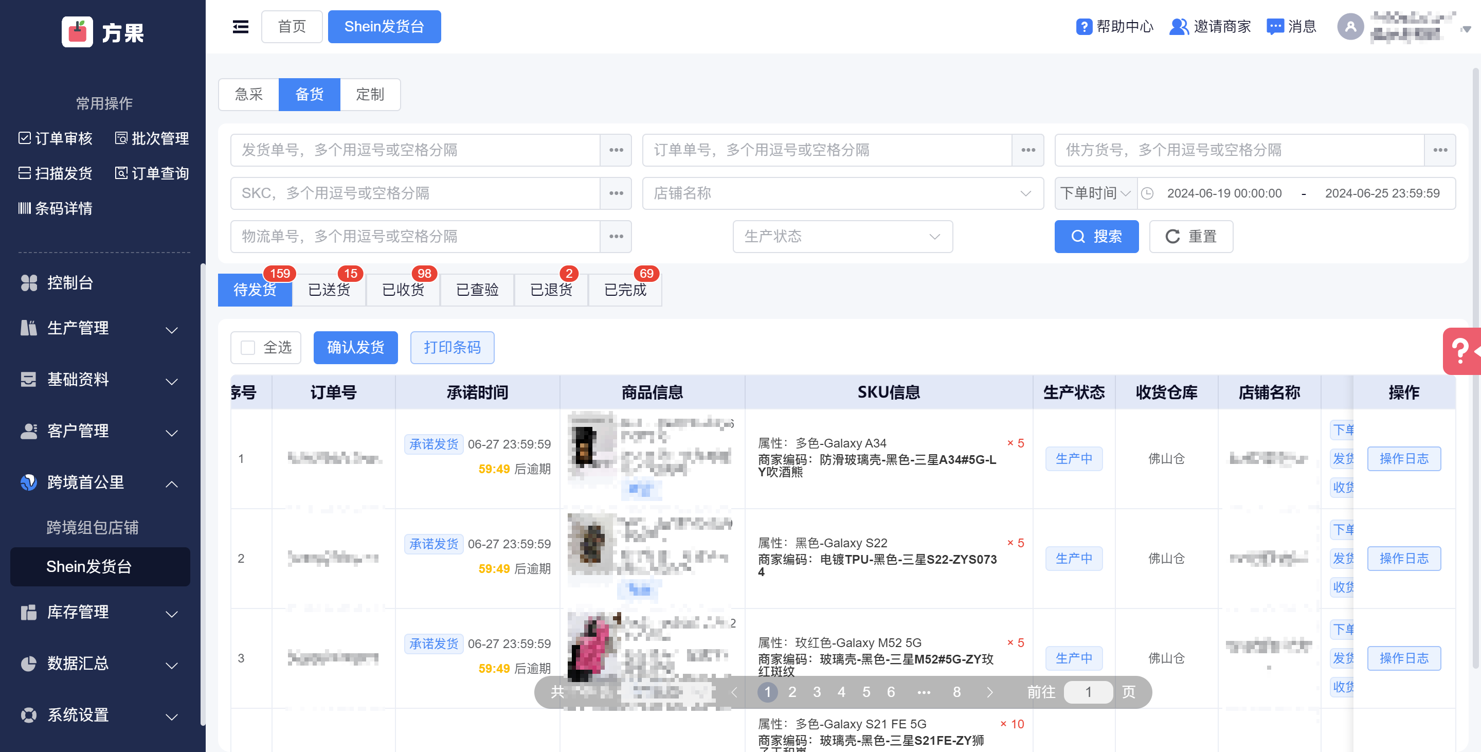 • 注:扫描发货时,每扫一个我们的方果条码,会自动出一个Shein条码,当整单的全部连续扫描完成后,才会打印面单,在扫描发货打印面单时,需要提前在发货台执行“确认发货”操作,不执行的话,不能打印面单。