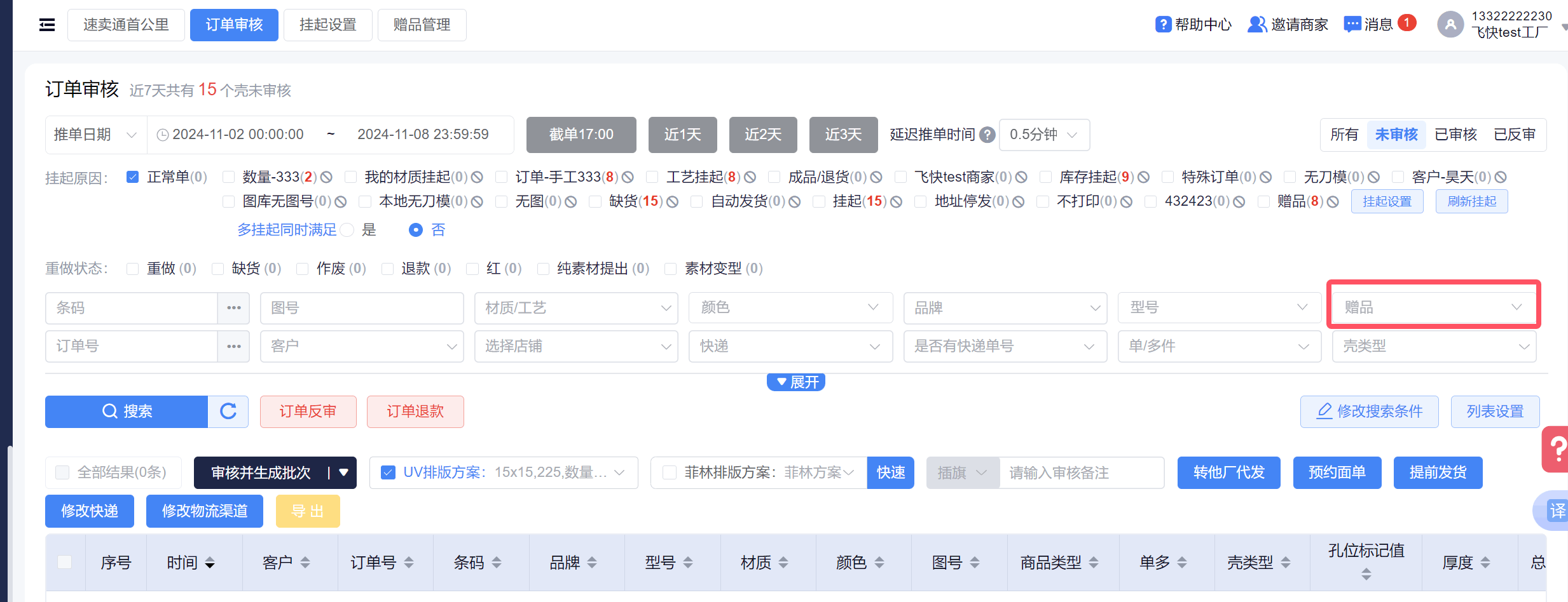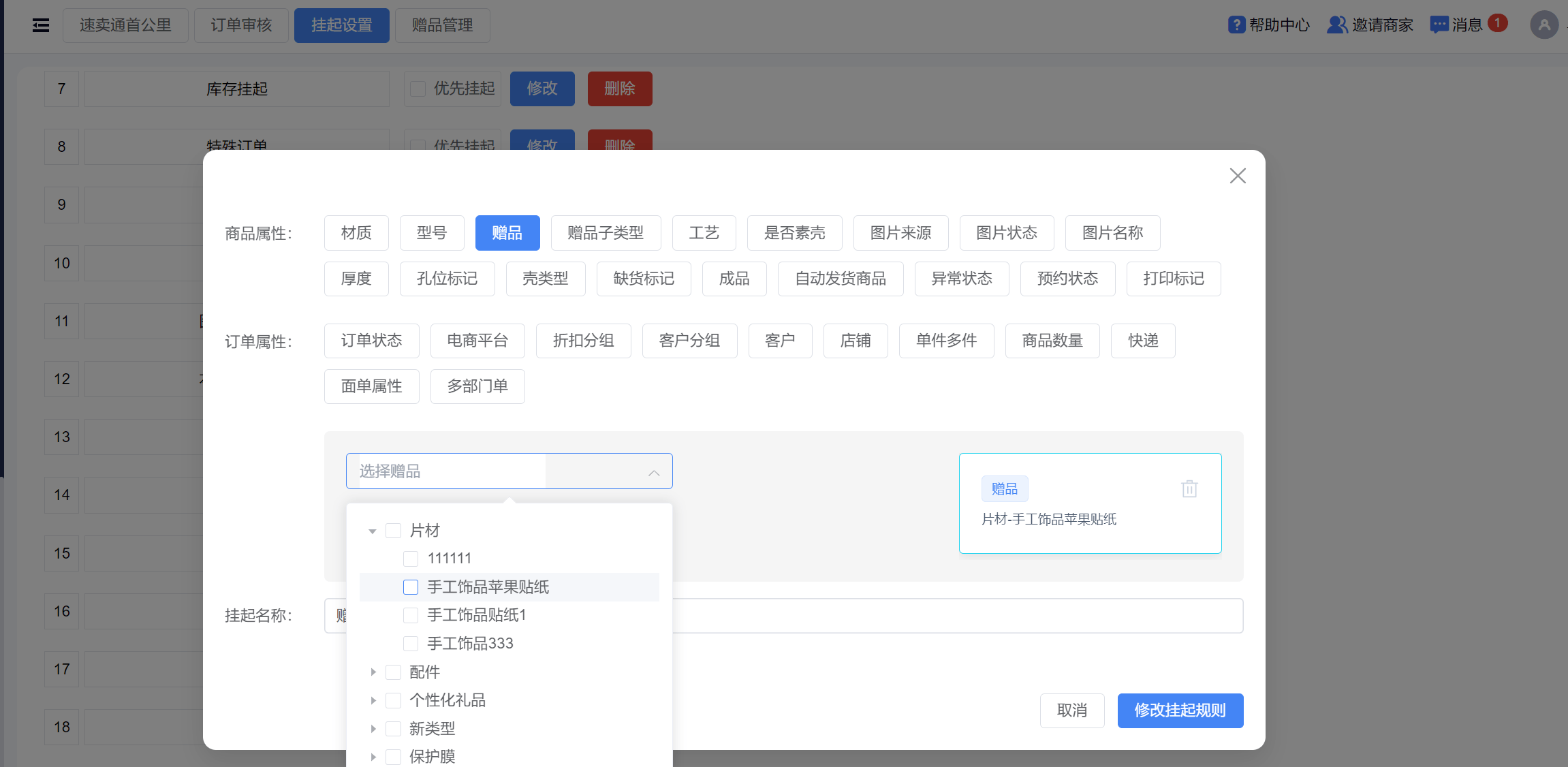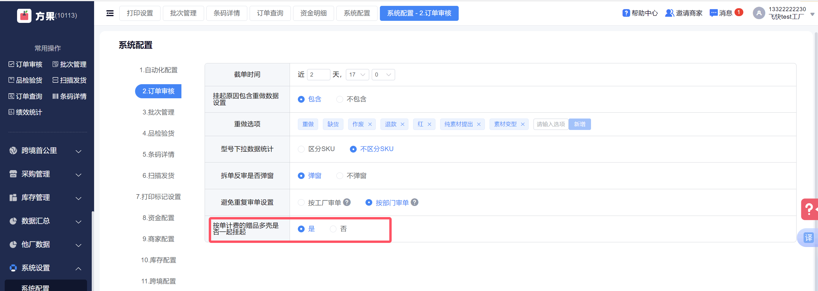 3、赠品挂起原因判断逻辑优化:订单审核时,若赠品管理设置了按单计费,且选中的赠品包含按单计费的赠品,则整个订单的所有条码需根据随单赠品信息判定是否挂起。判定依据来源于条码上的“随单赠品展示”字段信息和实际赠品信息。