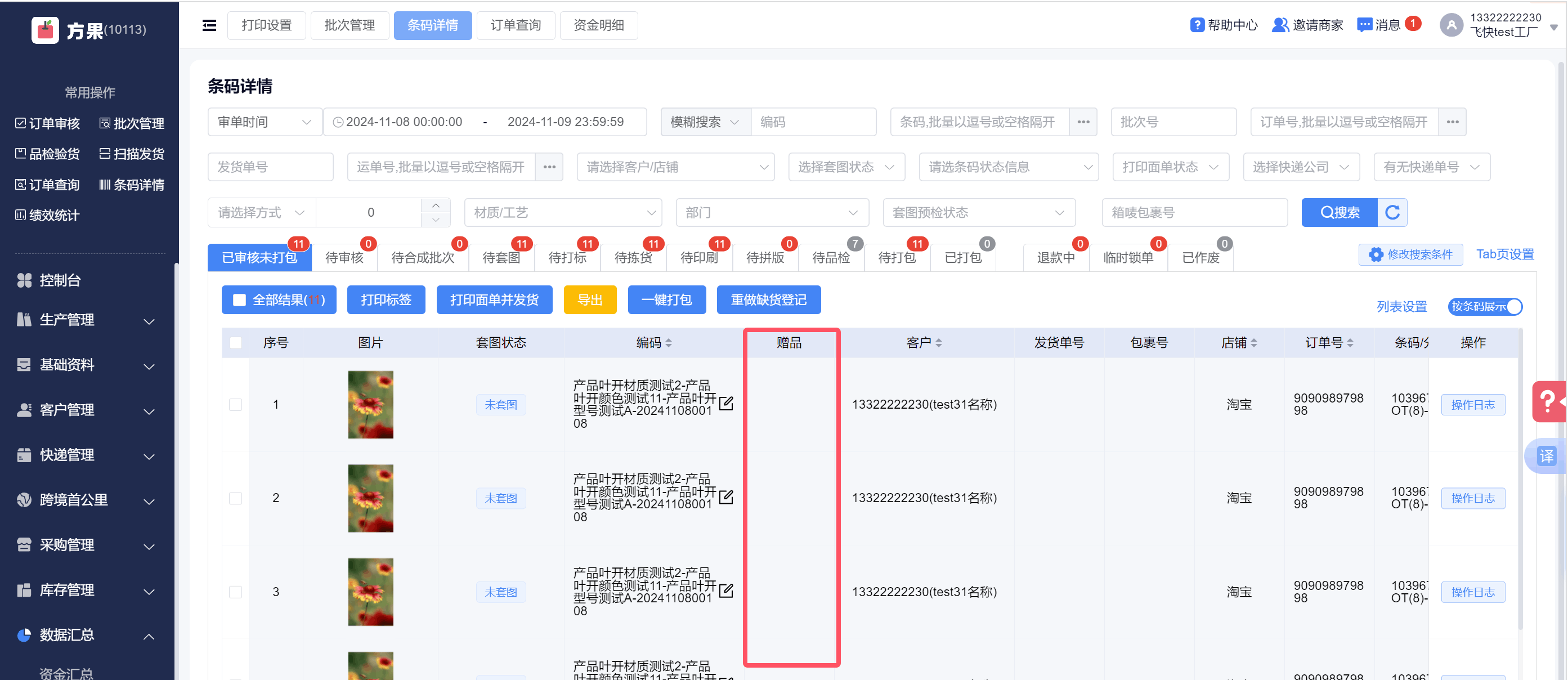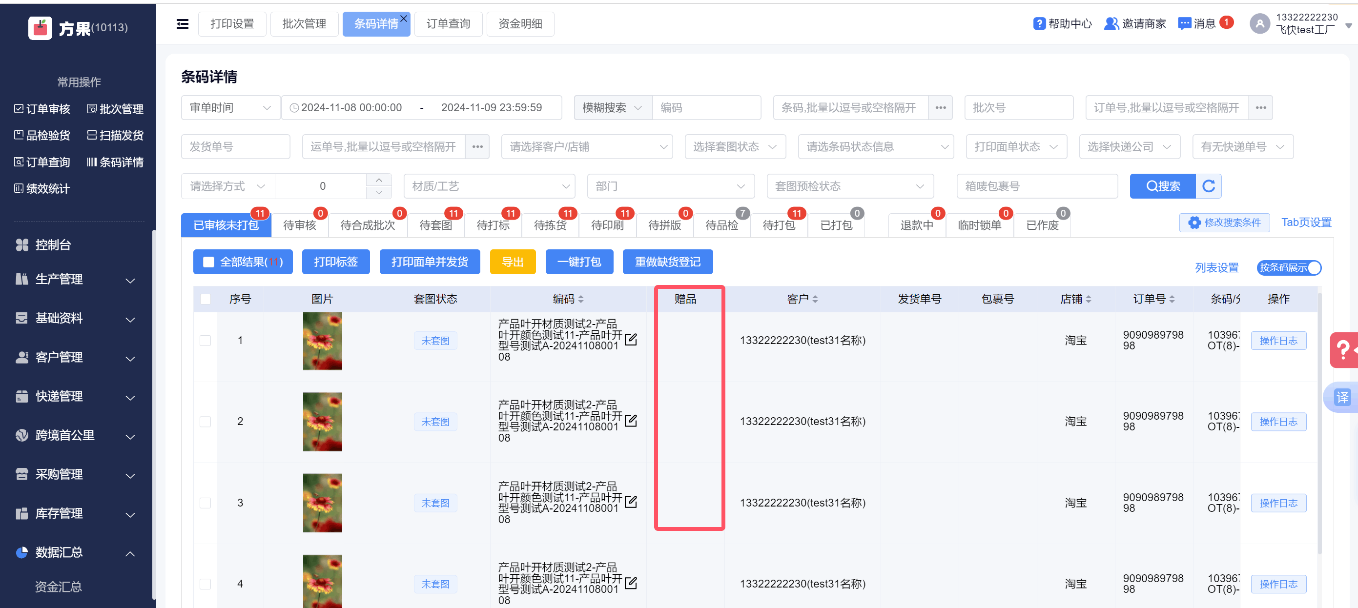 8、条码详情展示优化:数据列表的“赠品”字段取“随单赠品展示”/“实际赠品”字段信息。