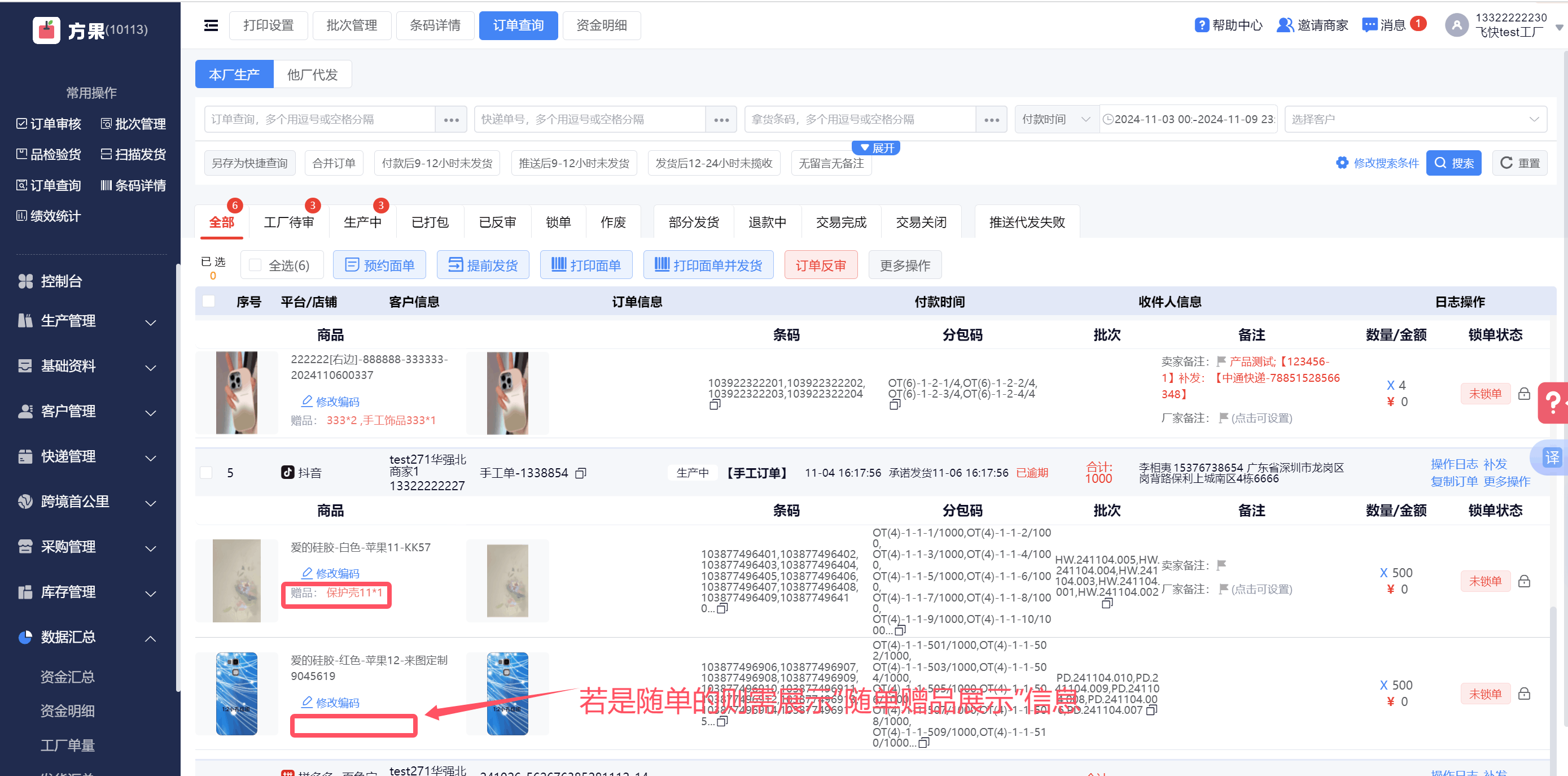 2、推单逻辑优化:在订单推单过程中,判断该订单是否包含随单赠品。若包含,则将随单赠品信息赋值到所有条码(其中有实际赠品的条码也包含)的“随单赠品展示”字段中。